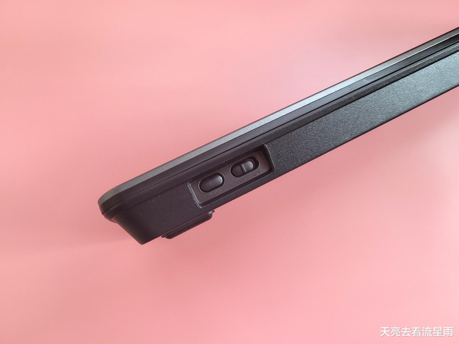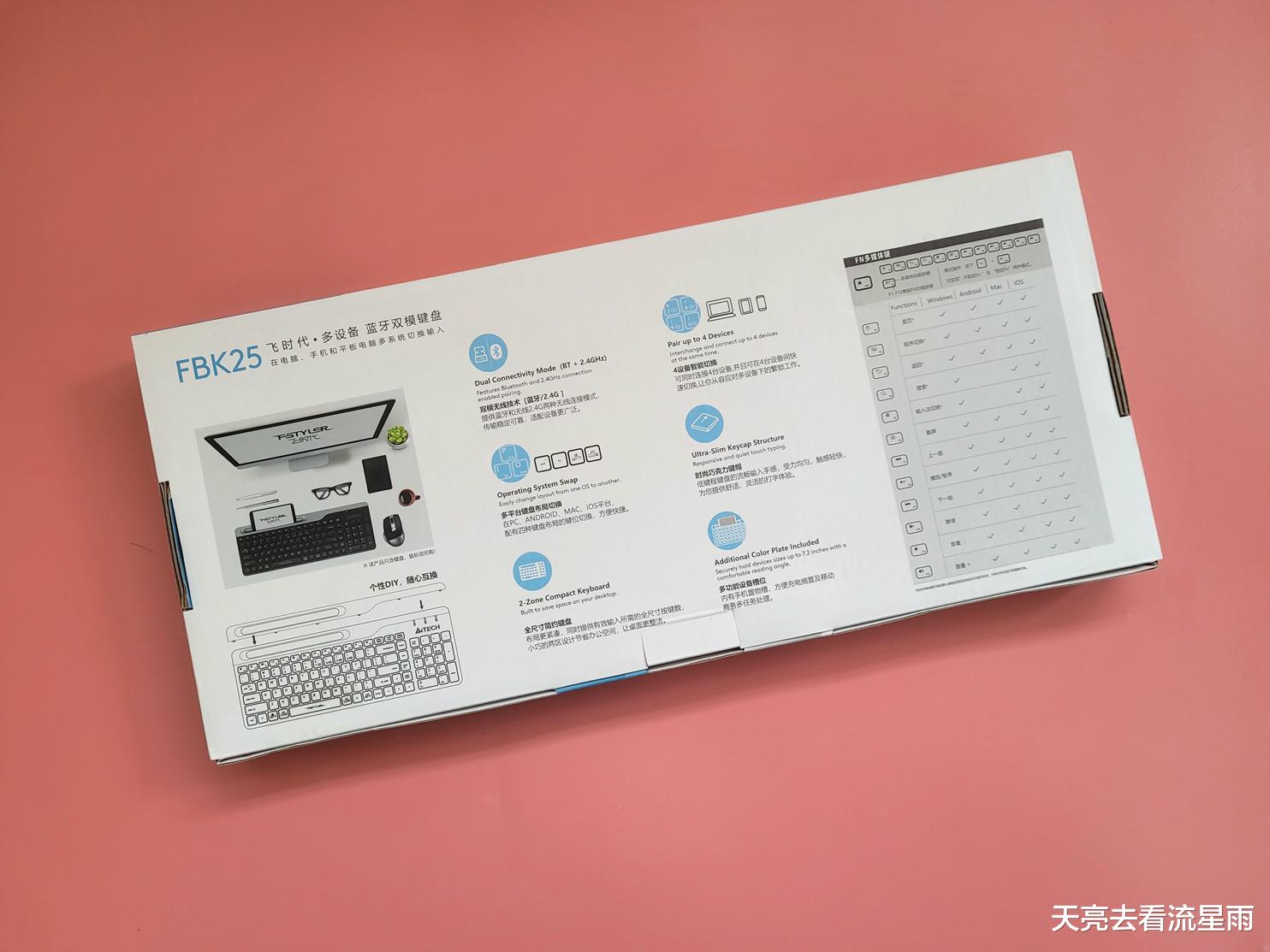 键盘顶部设计有一个置物槽,最实用的就是拿来放手机、平板了。手机横放竖放都可以,iPad mini可以竖放不能横放,10.6英寸的华为M6虽然竖放可以放进去,但是因为平板重键盘轻,无法放稳。这个置物槽设计有时候手机、平板上聊天或者写评论啥的,蓝牙连接上用键盘码字比手机敲字总是速度快些。FBK25键盘支持多设备、多系统、多模式连接,支持手机、平板、笔记本电脑蓝牙连接,支持台式电脑2.4G无线连接,最多能同时连接4台设备,支持Mac/IOS/Win/Android/UOS不同的操作系统,通过Fn加功能键即可实现配对、切换等操作。