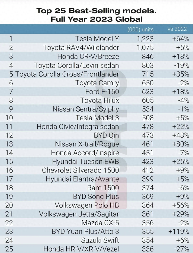 此外,Jato Dynamics的数据还指出,在2023年,新兴经济体的新车销量超过1750万辆,占全球总销量的22%,已经超过了在美国和欧洲。因此,很多传统车企都是依靠打开“新兴经济体”的新市场,来实现2023年的销量增长。而特斯拉在没有进入“新兴经济体”的情况下,依然取得了Model Y销量全球第一的成绩。