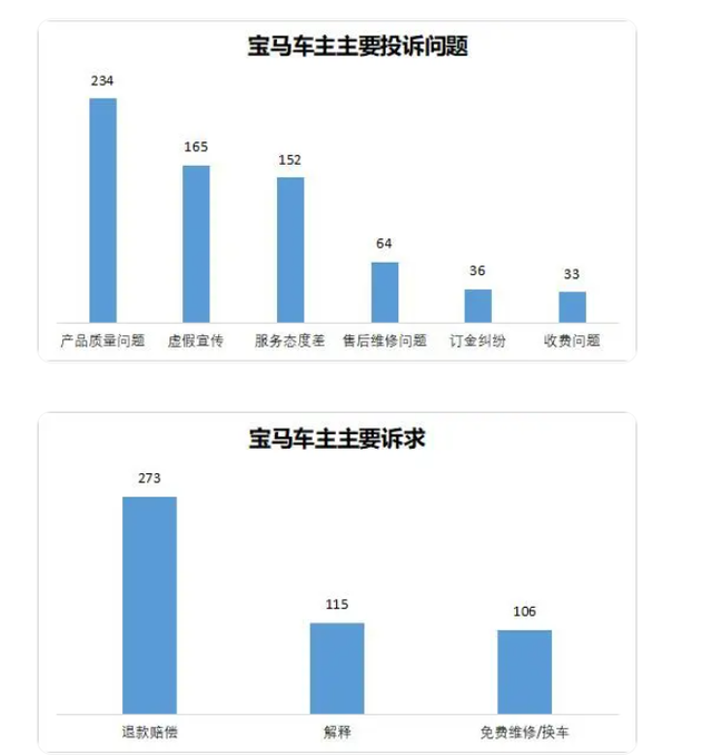 根据中国电子商会旗下的平台消费宝的投诉显示,今年上半年,和宝马相关的投诉为446件,而且一直都在增长。其中产品质量问题投诉达到234件,虚假宣传为165件,服务态度差为152件,其他的则是售后服务,定金纠纷和收费问题。