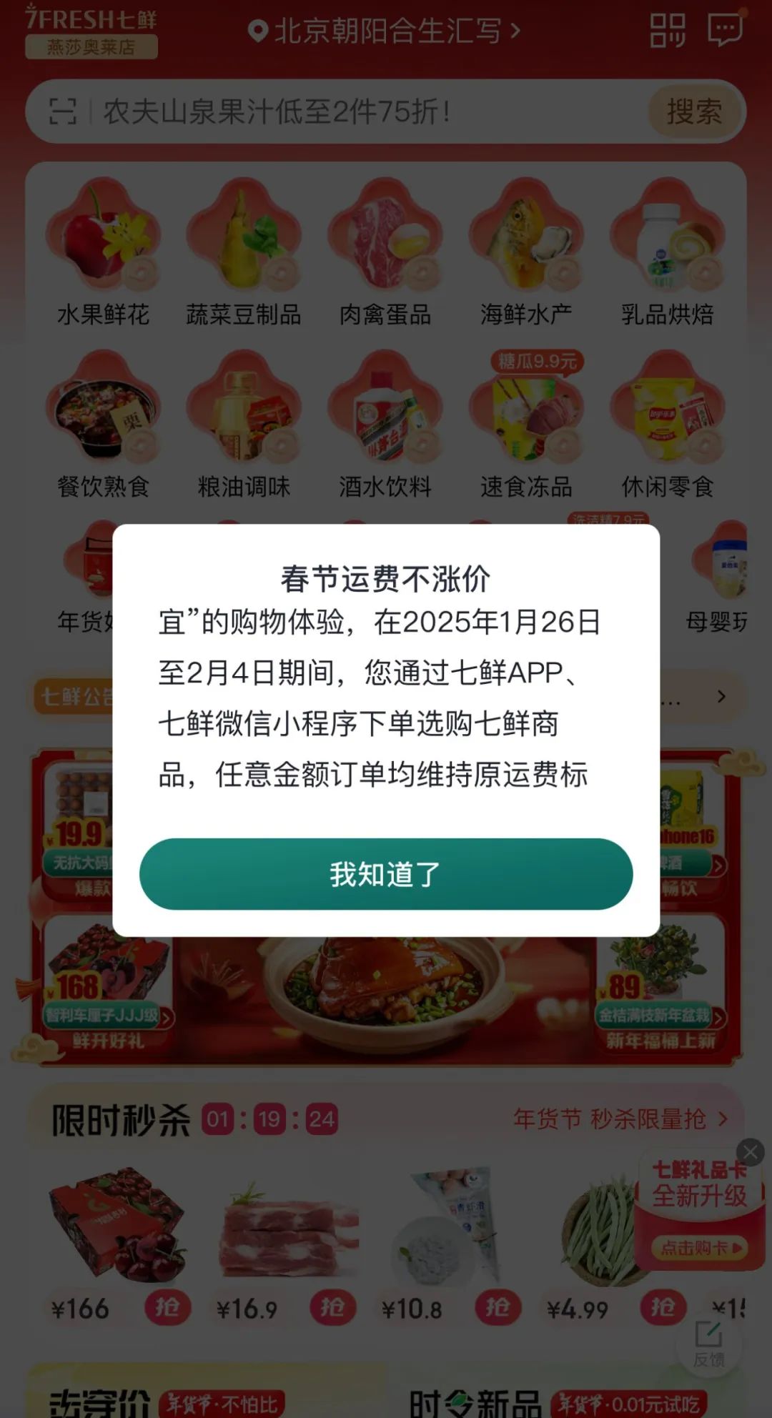 从京东七鲜官方可以看到,年货节击穿价商品数量和价格将再度加码,覆盖肉禽蛋品、饮料酒水、休闲食品、蔬菜水果、烘焙、水产等全品类。同时,秒杀频道每日分时段上线超值福利,折扣普遍达到7折,部分热销商品更是低至4-5折,轻松实现“低价购好物”。