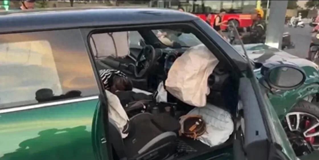 事故车辆据信是一辆绿色Mini。清晰可见,机舱内乘客安全气囊已经展开。