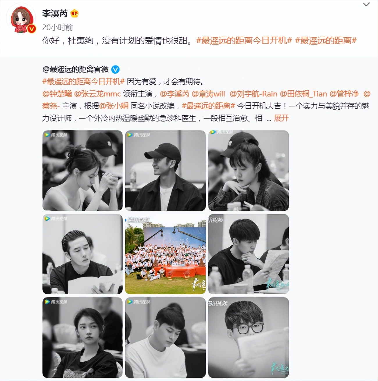 作为主演的李溪芮转发了《最遥远的距离》官微开机的官宣动态,并发文写道:你好,杜惠绚,没有计划的爱情也很甜。身着白色T恤,搭配牛仔裤的李溪芮,戴了2口罩清新可爱,真漂亮,期待李溪芮新角色,开机大吉!