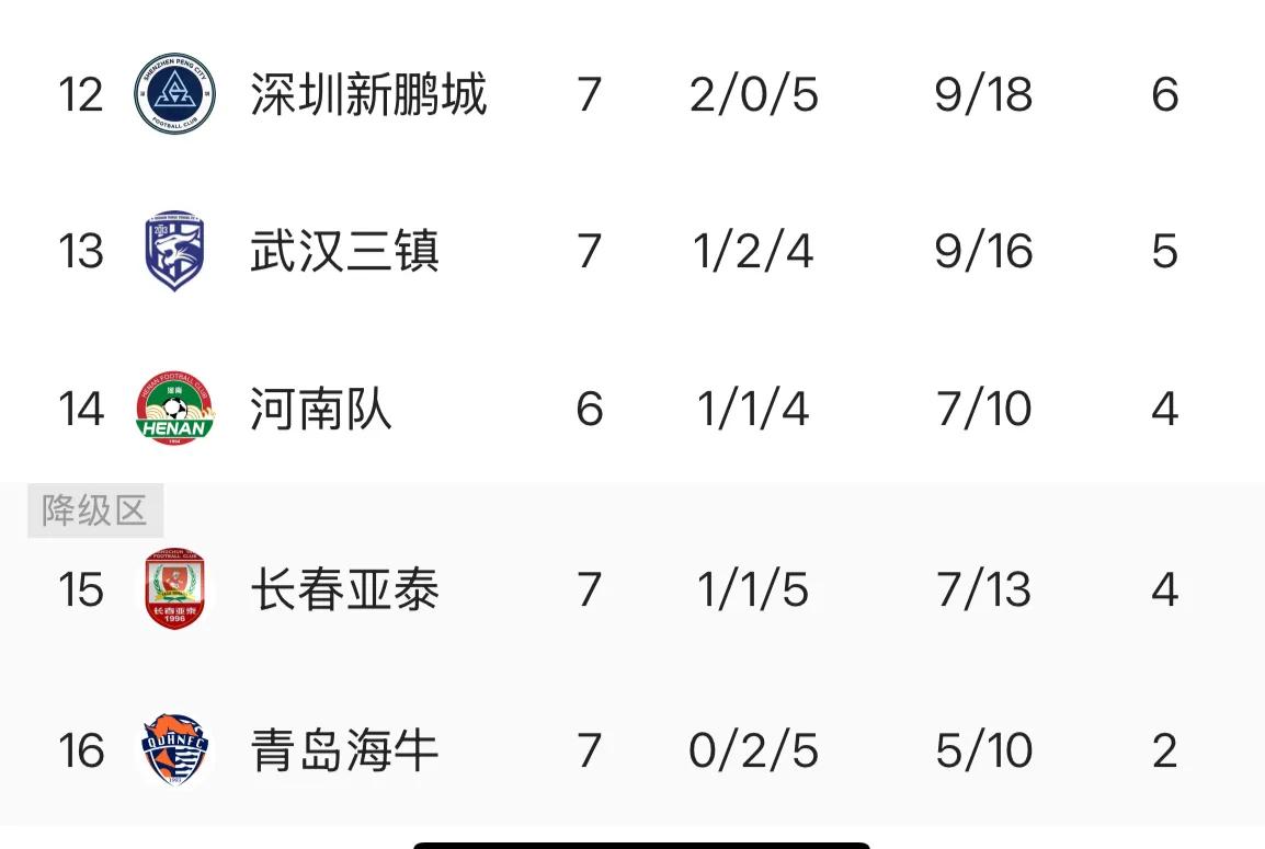 7轮比赛战罢,中超的保级球队已经基本形成了。7轮比赛以后积分不到7分(场均1分)的有5支球队,分别是6分的深圳、5分的武汉、4分的河南和亚泰,2分的青岛海牛。很显然,青岛海牛最危险!