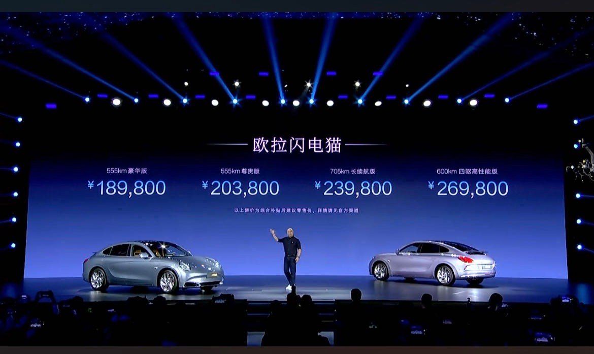 本次发布会,欧拉闪电猫公布四款车型,分别为600km四驱高性能版,综合补贴后售价26.98万元;705km长续航版,综合补贴后售价23.98万元;555km尊贵版,综合补贴后售价20.38万元;续航555km豪华版,综合补贴后售价18.98万元。此外还包含“无忧购车”、“无忧用车”、“选装折扣”三重惊喜上市权益。诚意十足的价格,让更多的年轻人、家庭用户都可以享受到闪电猫带来的惊艳之旅。