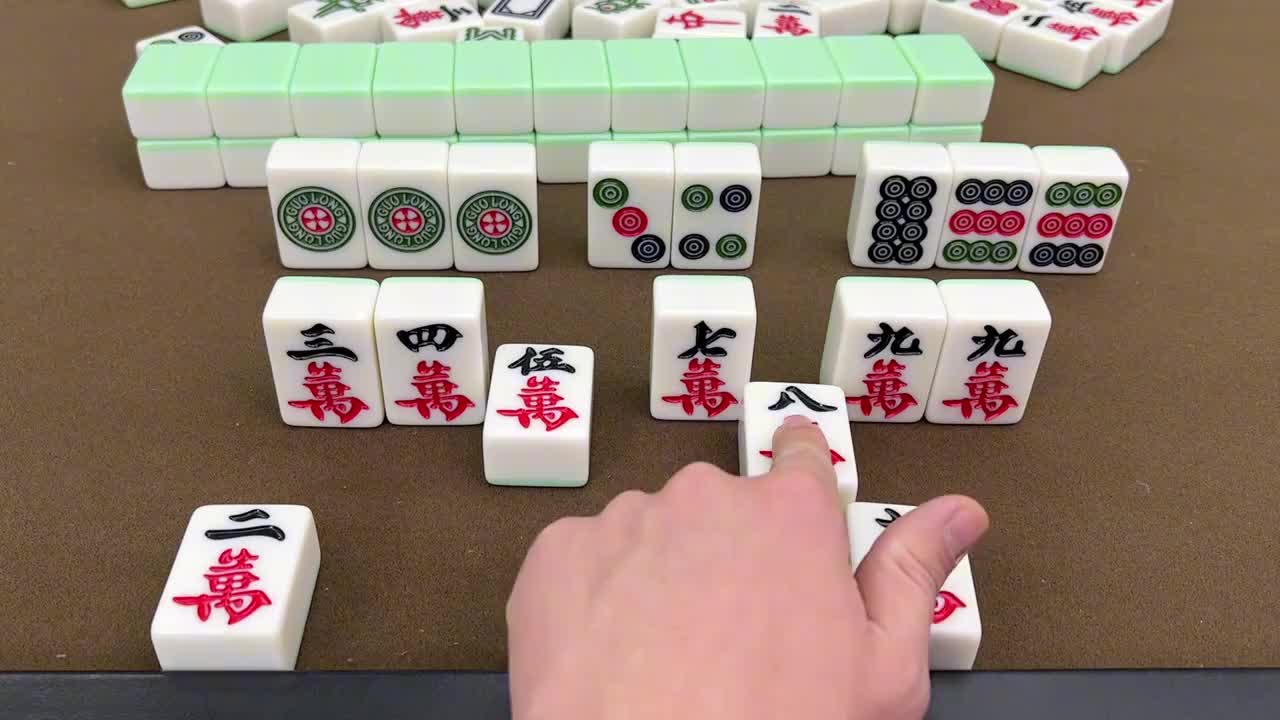 六搭牌我们现在要做的就是要拆搭,因为根据我们五搭牌的一个胡牌架构,我们需要四副成牌加一个对子,现在我们手里有一个成牌了,有两个对子,而且还是一个两对半的牌型,我们之前就说过,手牌两对半符合最大几率打法,九万的对子,九饼的对子,然后带一个八饼的边张搭子,两对半的牌型不能动,成牌不能动,所以说六搭牌需要拆搭