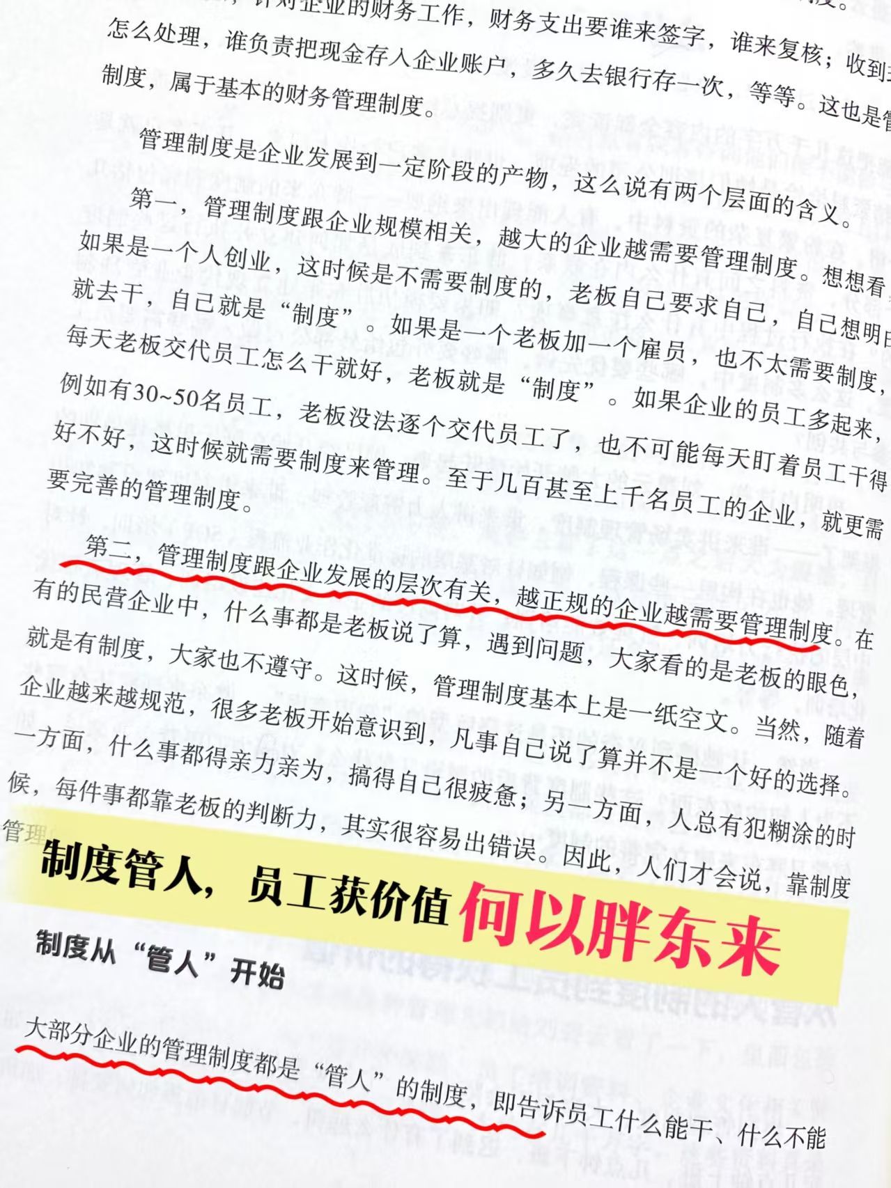 第二,管理制度跟企业发展的层次有关,越正规的企业越需要管理制度。在有的民营企业中,什么事都是老板说了算,遇到问题,大家看的是老板的眼色,就是有制度,大家也不遵守。这时候,管理制度基本上是一纸空文。当然,随着企业越来越规范,很多老板开始意识到,凡事自己说了算并不是一个好的选择。一方面,什么事都得亲力亲为,搞得自己很疲惫;另一方面,人总有犯糊涂的时候,每件事都靠老板的判断力,其实很容易出错误。因此,人们才会说,靠制度管理的企业意味着企业向正规化、现代化方向迈进了一大步。