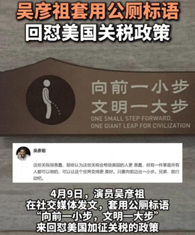 2025年4月9日,美国宣布对华加征104%关税当天,吴彦祖在社交媒体甩出中国公厕经典标语,还配上了马桶的照片。