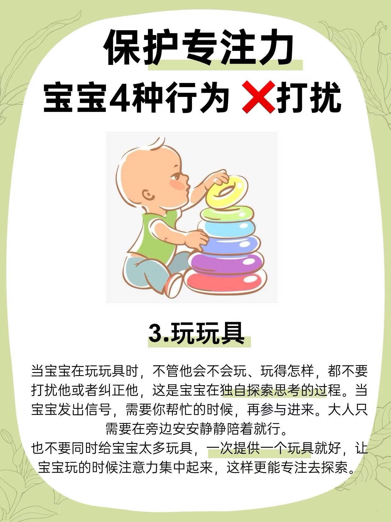 保护宝宝的专注力,就是要学会观察和尊重他们的自然发展节奏。家长的角色是提供一个安全、支持和鼓励的环境,而不是过度干预。通过不打扰宝宝在上述四种行为中的专注时刻,我们不仅能帮助他们建立起强大的专注力,还能促进他们的认知、情感和社交技能的全面发展。