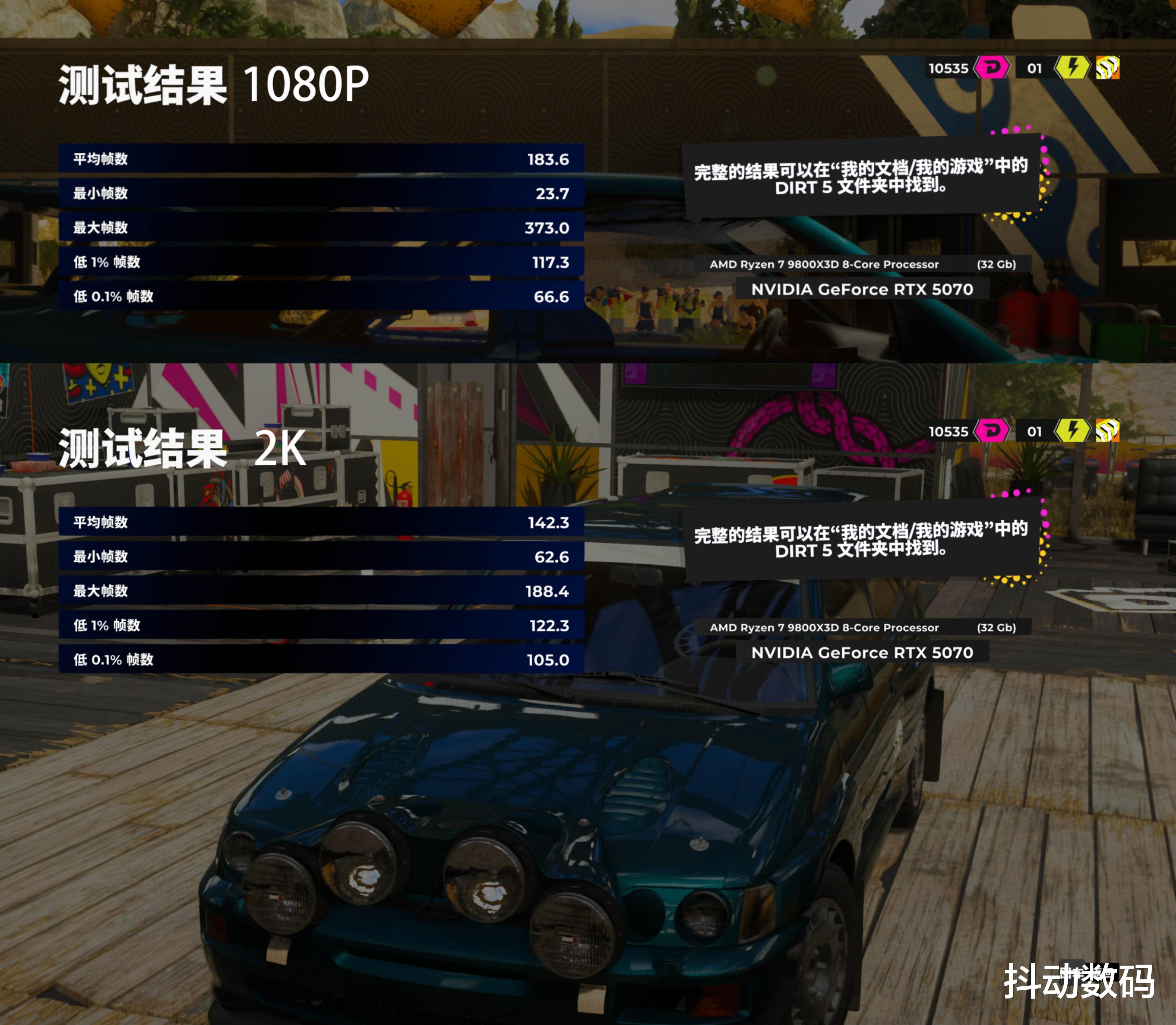 「尘埃5」游戏1080P分辨率,预设超高画质下,同时开启光线追踪车辆阴影游戏平均帧数183.6FPS,最低帧23.7FPS。