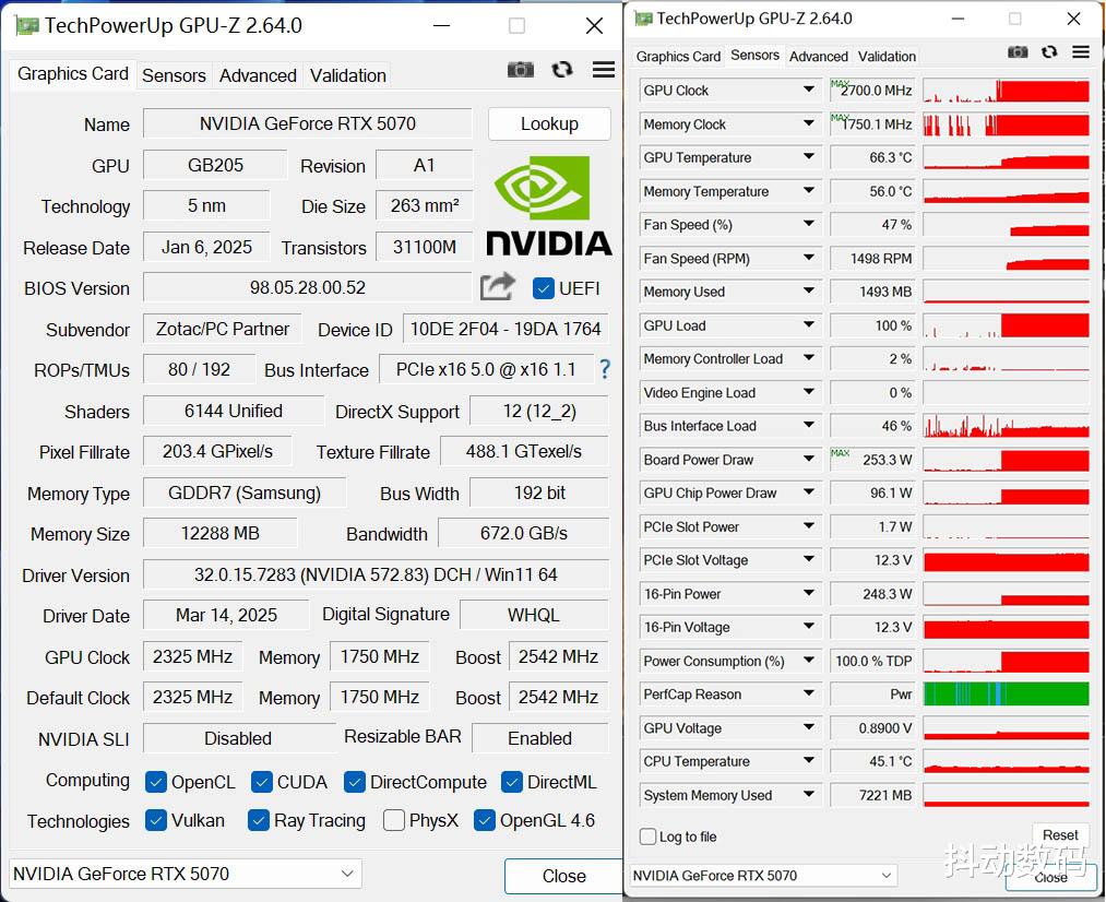 GPU-Z查看索泰RTX 5070 12GB XGAMING OC显卡信息,Base:2325MHz,Boost:2542MHz。