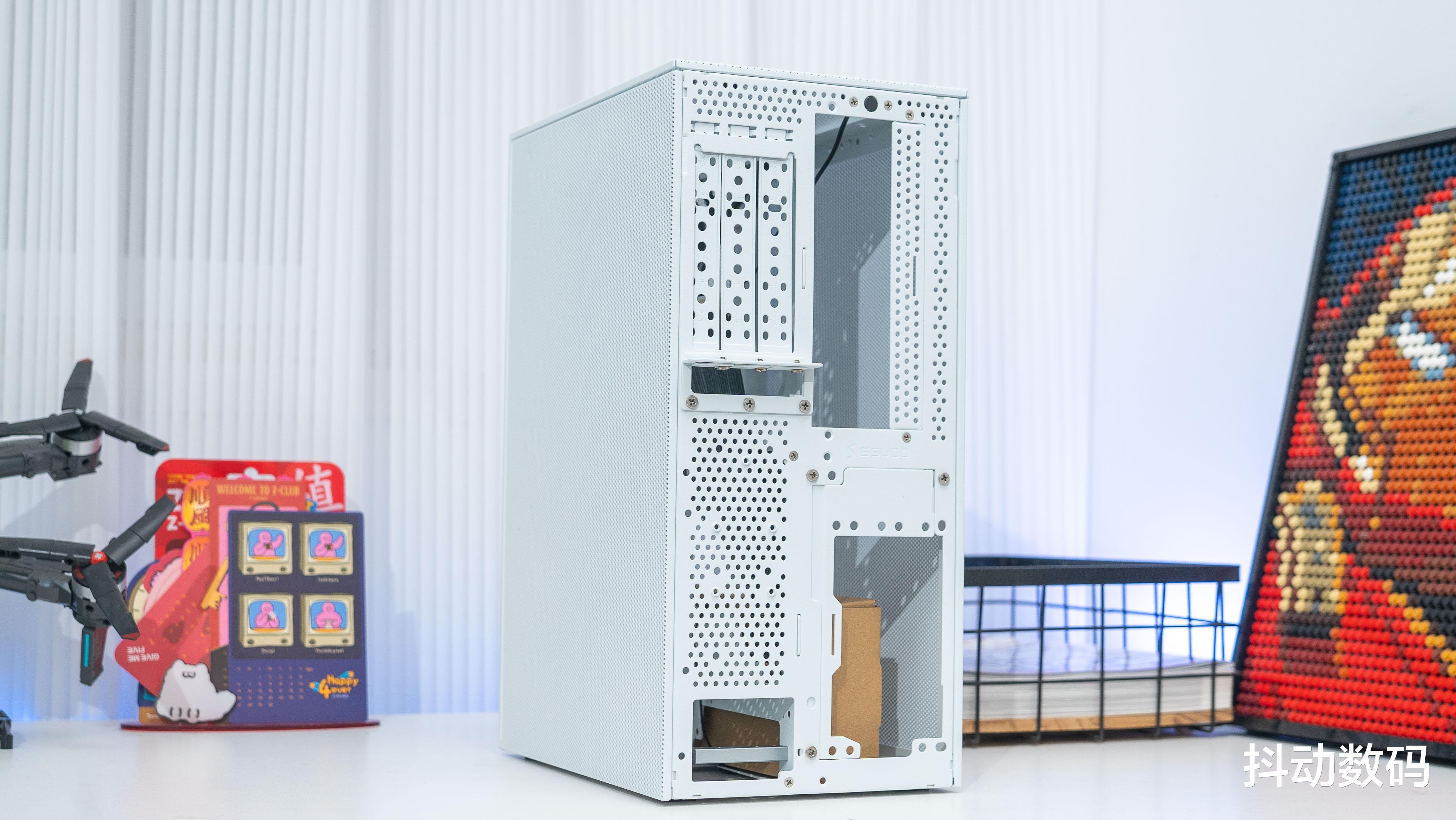 机箱IO接口一侧一览,直立式结构设计。主板设计在电源仓上方,标准A4结构设计,主板和显卡背靠背安装。显卡最大可以兼容336mm长度显卡安装,最大支持4槽厚度显卡的安装。对于目前旗舰级的50系显卡具有不错的兼容性。