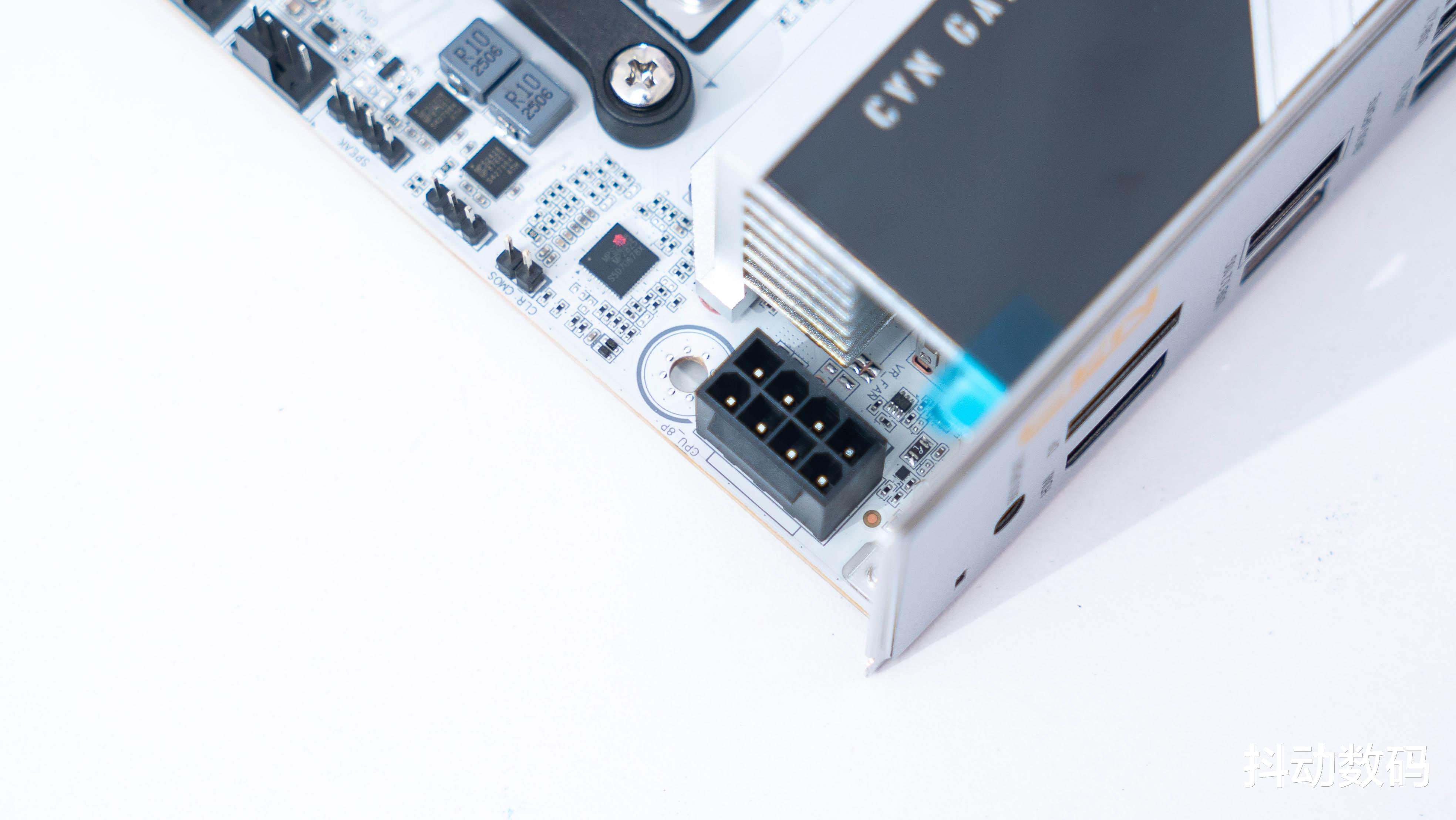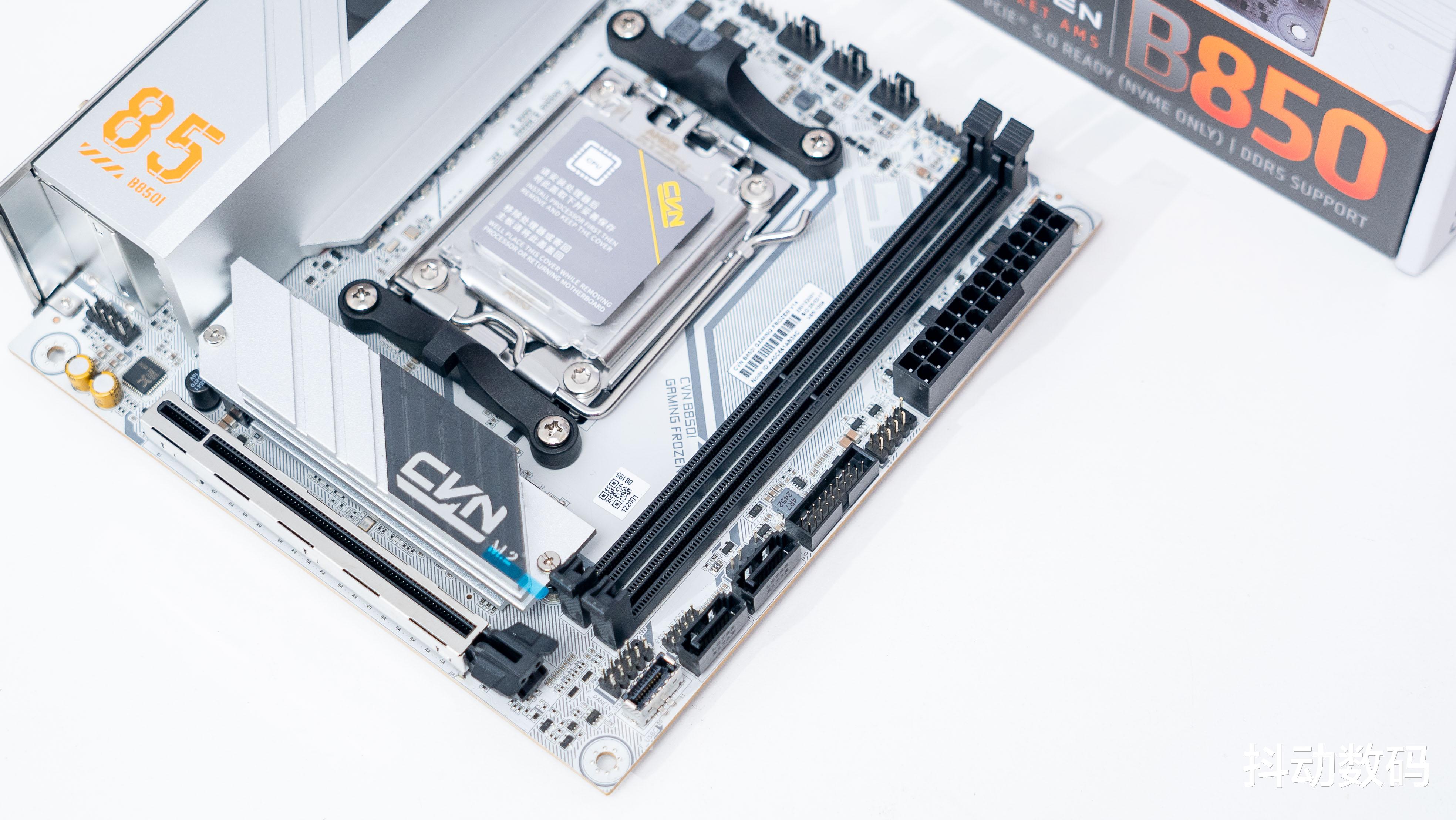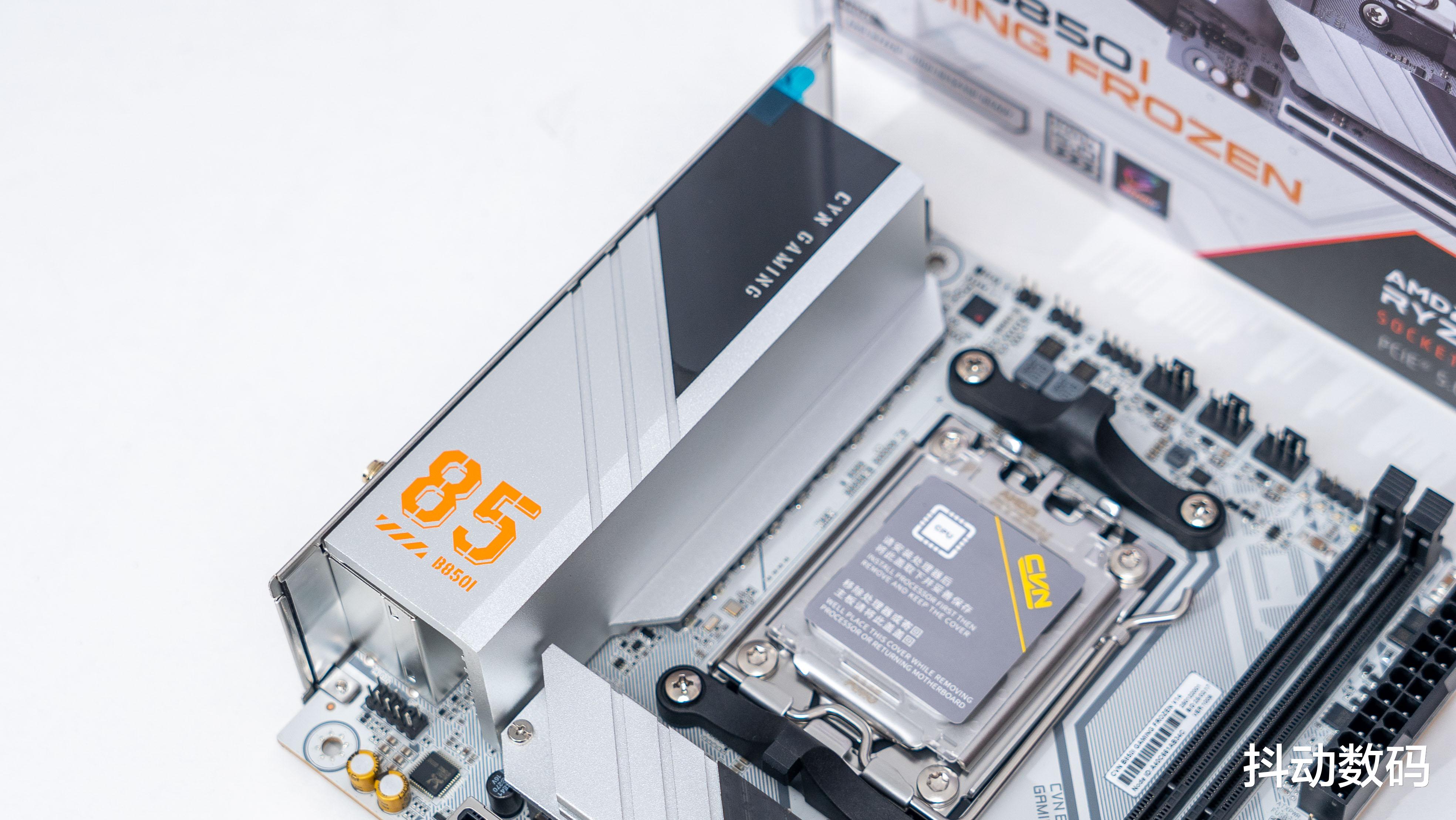 七彩虹 CVN B850I GAMING FROZEN V14 登陆舰搭载服务器级 10 层 PCB,IO供电区域的散热装甲设计延续了七彩虹CVN军规风格设计,B850i主板装饰了数字85。