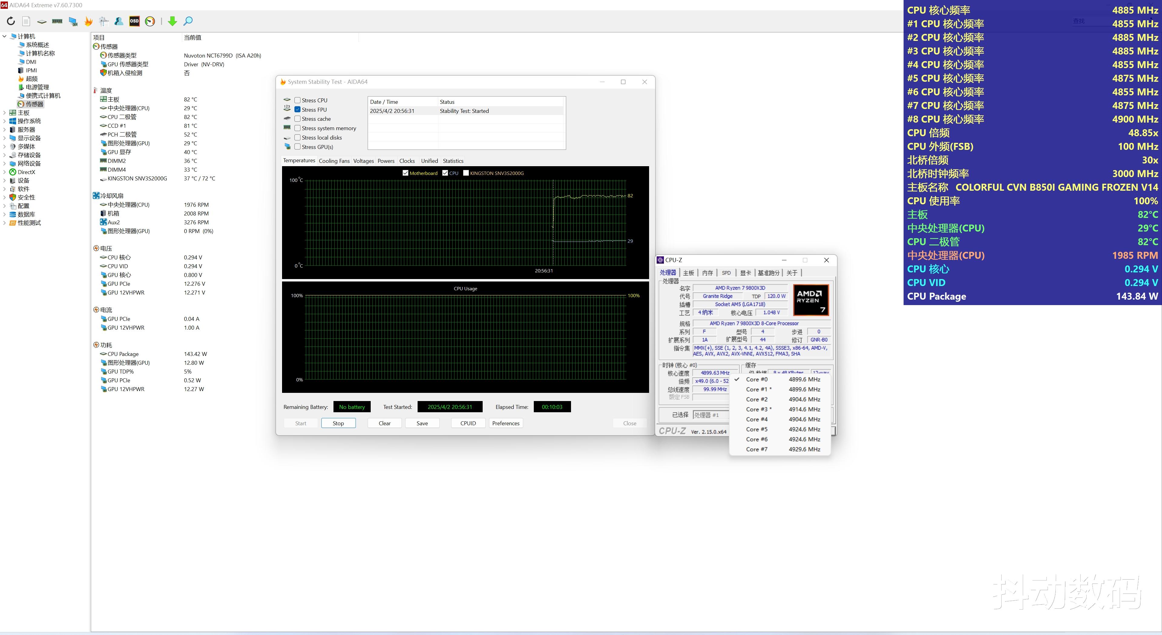 烤机测试方面,九州风神冰果240水冷表现还是不错的。在AIDA 64 FPU单烤测试,9800X3D核心频率4.9GHz,CPU Package温度82℃。