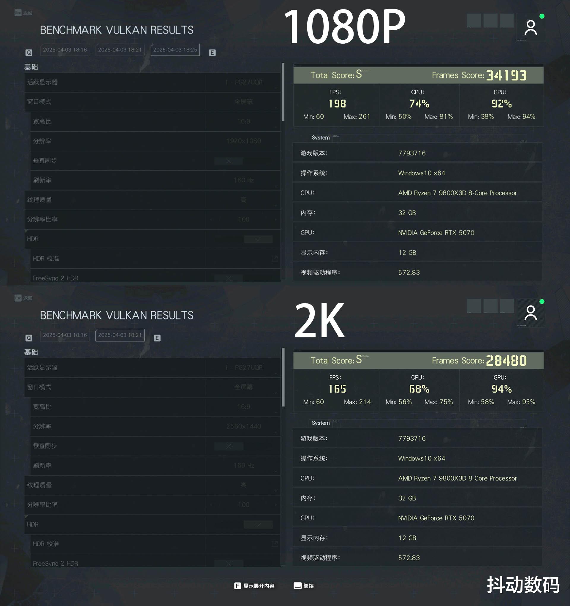 2K分辨率最高画质下游戏平均帧数165FPS,最小帧60FPS,得分28480分。