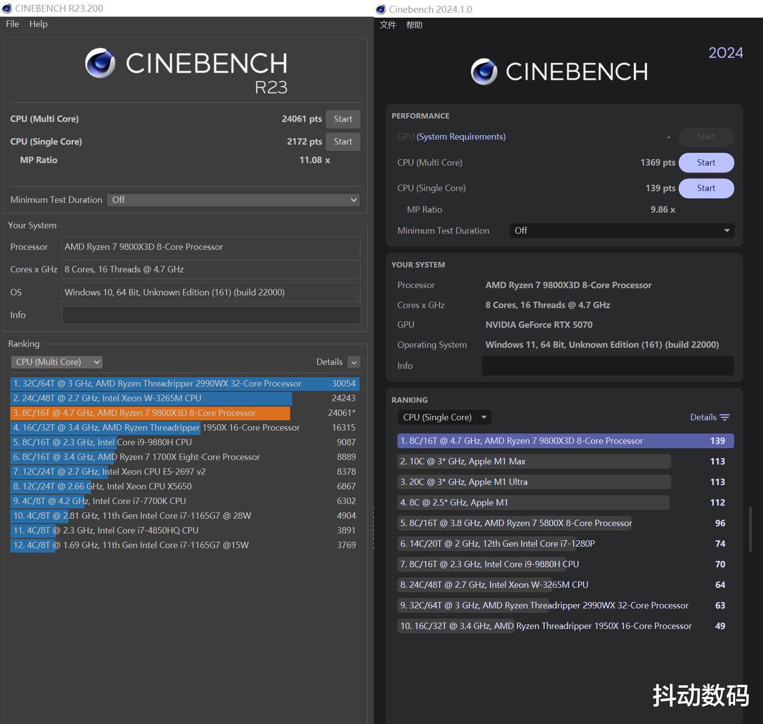 Cinebench R23测试CPU多核分为24061 pts,单核 2172 pts;