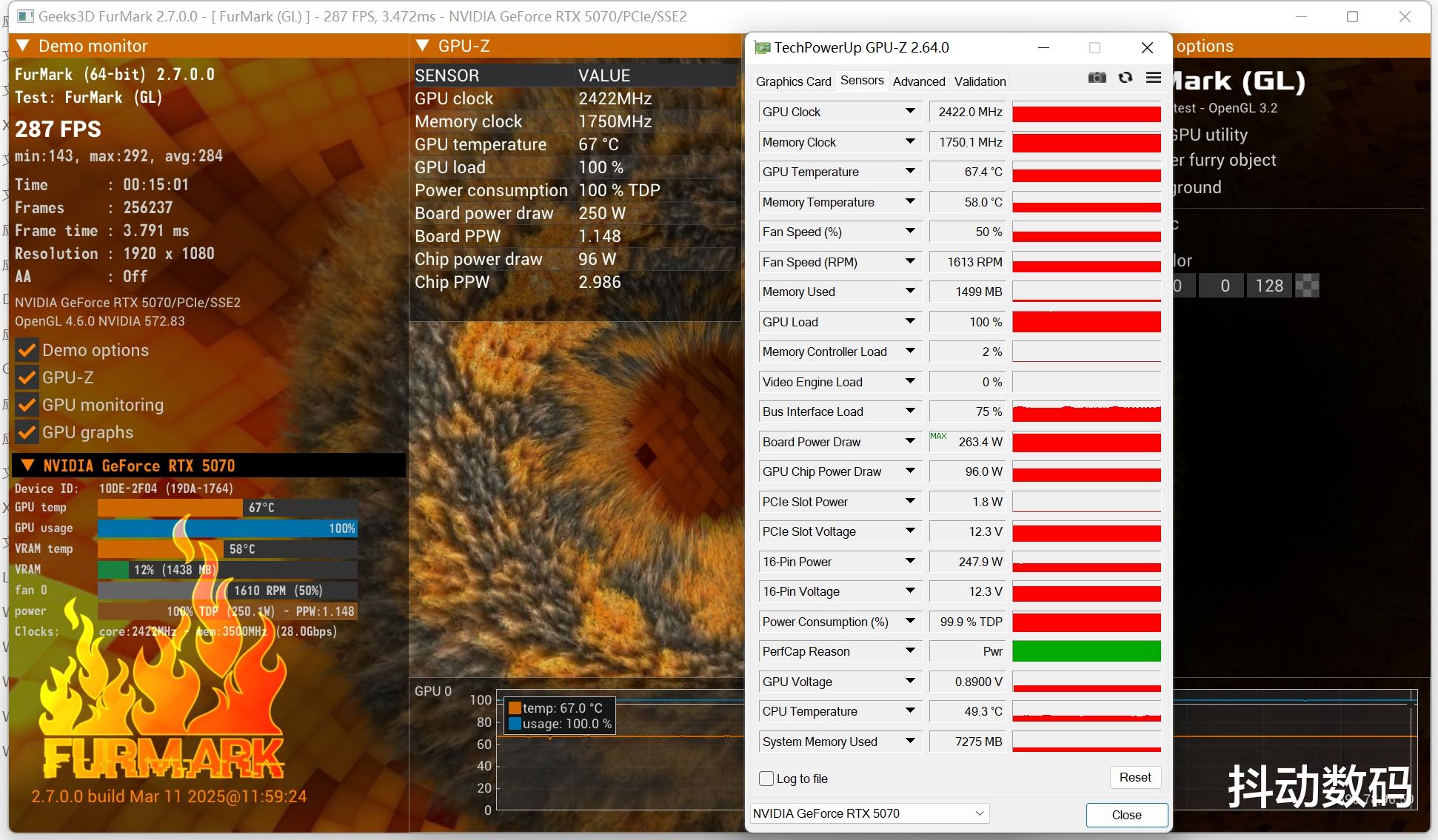 索泰RTX 5070 12GB XGAMING OC显卡在机箱内竖装下烤机测试,可以看到在Furmark压力测试15分钟的情况下。显卡平均频率2422Mhz,显卡温度67.4℃,显存温度58℃,显卡功耗250W。可以看到这款显卡在竖装状态下并不会受到影响,整体发热还是在可控范围下。
