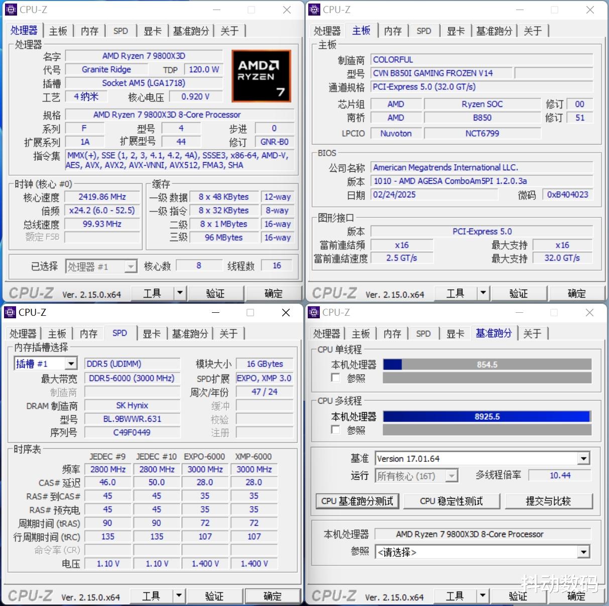 以下测试均为手动PBO下测试结果,首先是CPU-Z测试9800X3D多核性能:8925.5,单核:854.5;