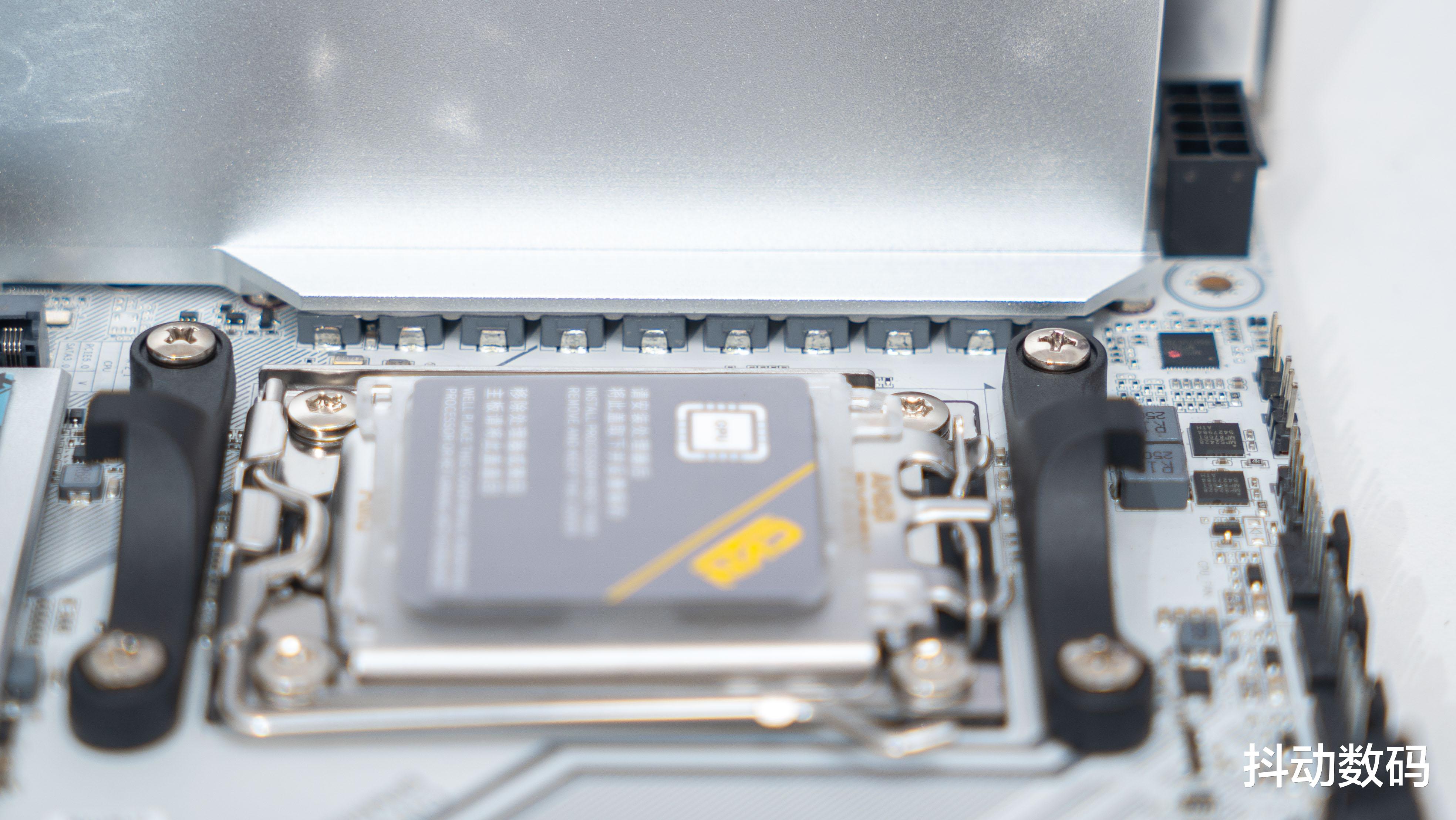 PCIe 5.0 x16合金强化内存插槽设计,主板正面的M.2 接口为CPU直连的PCIe 5.0速率,而且配置独立的散热模块,单独散热模块厚度相比前代ITX主板可是厚了很多。
