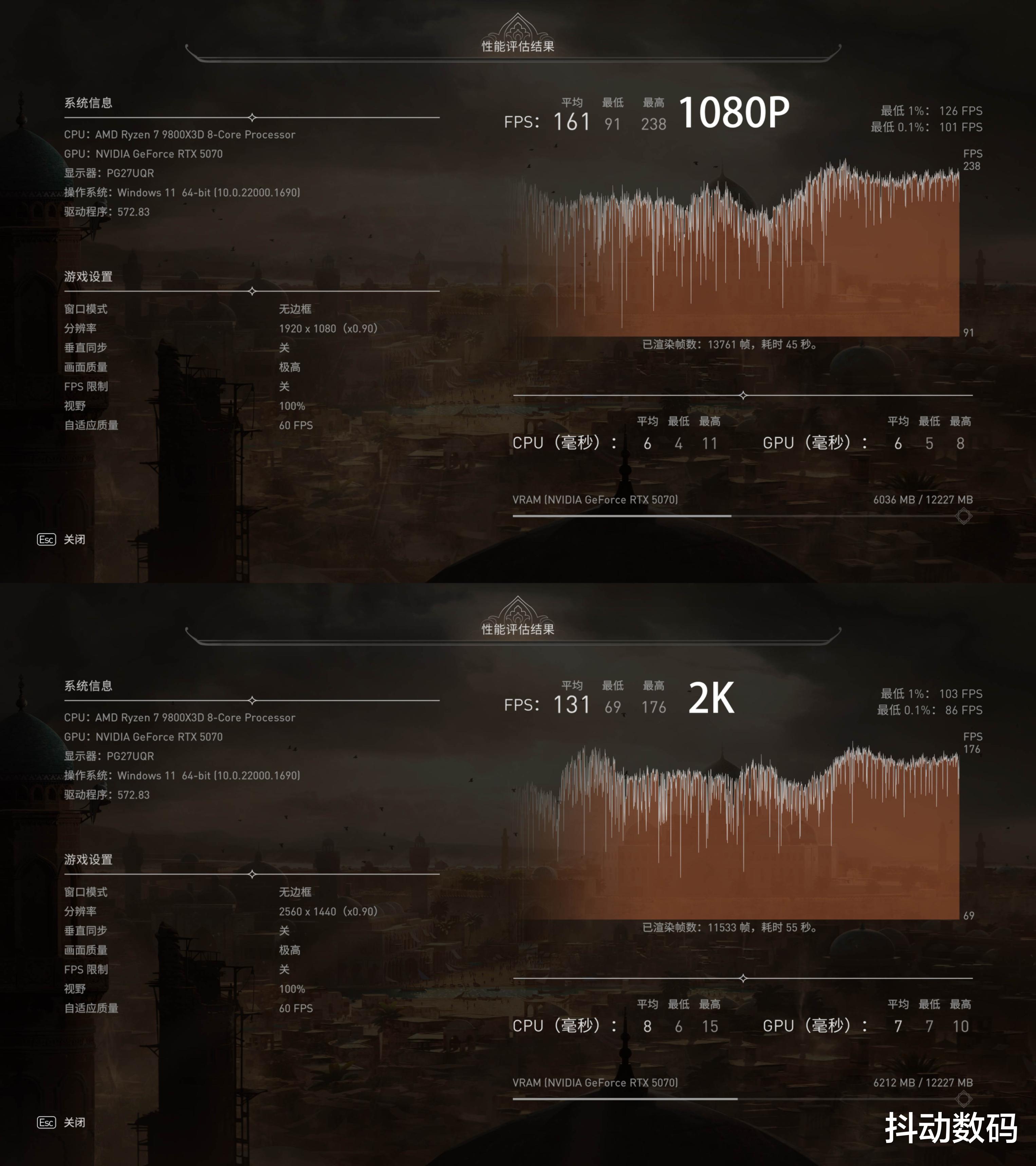 2K分辨率最高画质下游戏平均帧数131FPS,最低帧69FPS。