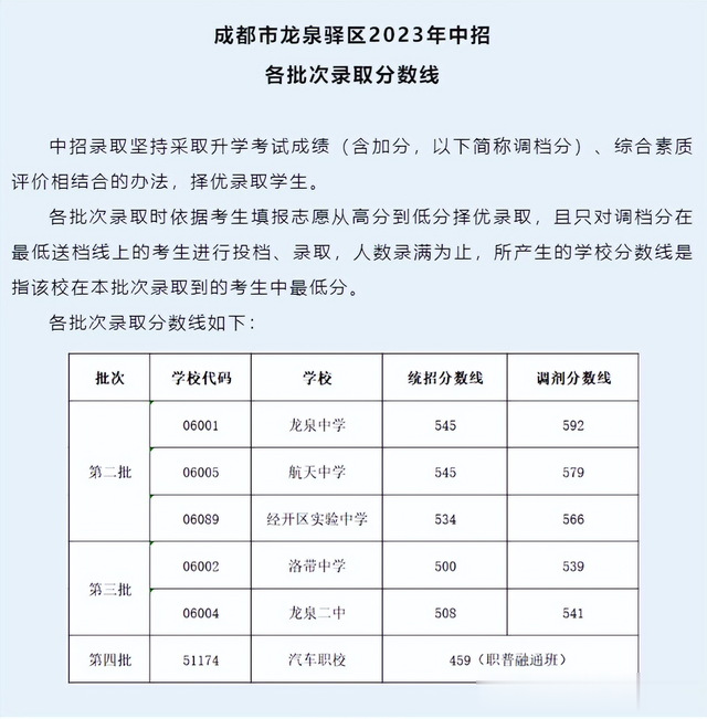 第二批:洛带中学统招分数线494、调剂分数线503;龙泉二中统招分数线504、调剂分数线507。