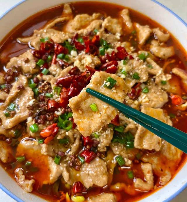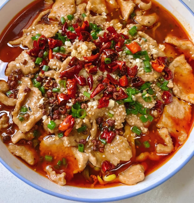 6.在肉片上撒点干辣椒、花椒、蒜末,淋上热油,香味就出来了。