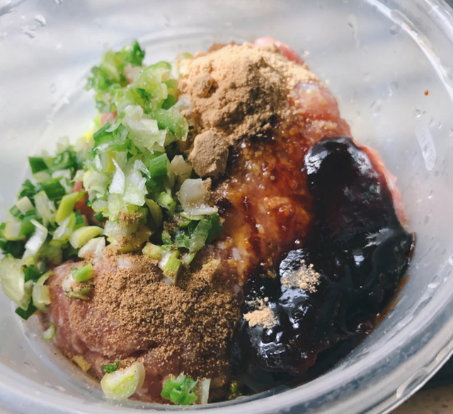 3.把肉馅、葱、鸡蛋、姜粉(或者姜粒儿)、盐、糖、甜面酱(这个很重要)、生抽、老抽、香油都混在一起,搅得匀匀的。