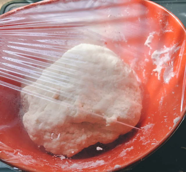 2.用温水和成面团,用保鲜膜封好,让它醒1个小时。