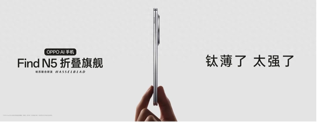 OPPO Find N5 的发布,标志着折叠屏手机进入了一个全新的 “8 毫米时代”。这款手机致力于打破折叠旗舰的厚度瓶颈,机身薄至 8.93mm,无论是展开还是合上,都展现出极致的轻薄。展开时,Type-C 接口高度近乎等同于整机厚度;合上时,厚度率先突破 9 毫米大关,与直板旗舰相比也毫不逊色,携带毫无负担。这一卓越成就得益于 OPPO 自主研发的钛合金天穹铰链,其厚度仅 2.35mm,最薄零件达 0.15mm。OPPO 采用航空级钛合金 3D 打印技术,历经 1700℃超高温熔炼等复杂工艺,使铰链整体减薄 26% 的同时刚度提升 36%,完美实现坚固耐用与轻薄便携的结合。并且,Find N5 首次通过德国莱茵 TÜV 无感折痕认证,成为全球首款且唯一获此认证的折叠手机,为用户带来平整顺滑的大屏使用体验。