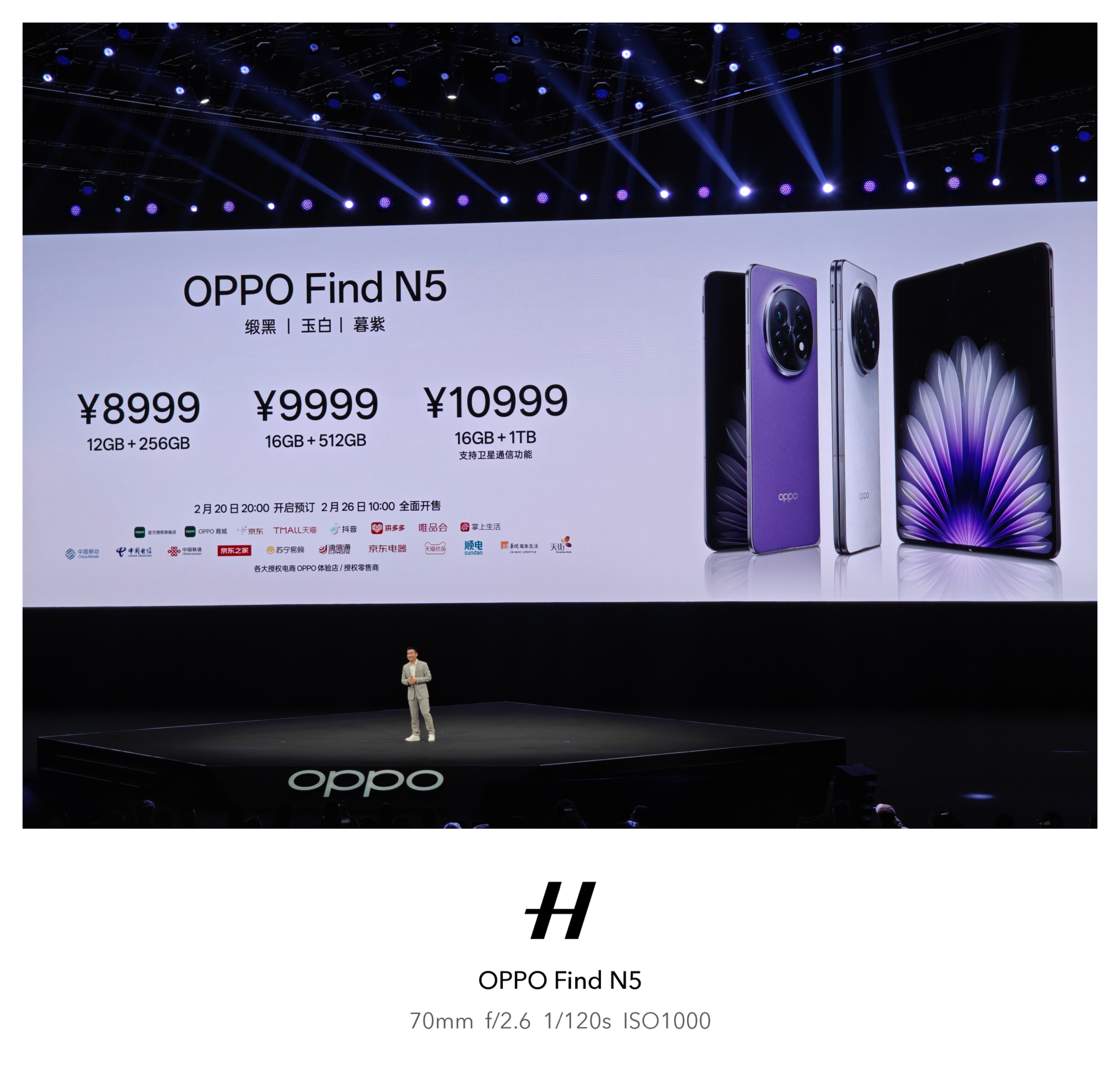 OPPO Find N5 提供玉白、缎黑、暮紫三款配色,12GB + 256GB 定价 8999 元,16GB + 512GB 定价 9999 元;16GB + 1TB(支持卫星通信功能)定价 10999 元,2 月 26 日正式开售。首销期间预订并购买的用户,最高可享受 24 期分期免息。Find N 系列老用户和 iPhone 用户,可享受以旧换新专属福利,最高补贴 1800 元。3 月 1 日,到武汉楚河汉界旗舰店购买 Find N5 还将赠送碎屏保。