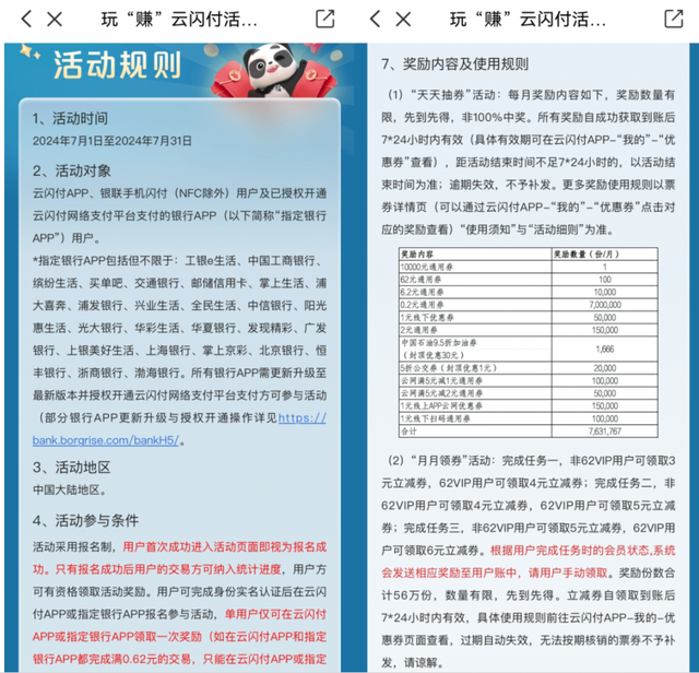 从7月1日至7月31日,只要每天使用62开头的银联卡通过云闪付完成一笔0.62元的线上或线下支付,就可以得到一次抽奖机会,最高能抽10000元呢!活动不仅奖励喜人,中奖名额更是惊人,足足有800万份,平时坐公交地铁,支付完就来抽个券,分分钟获奖呦!