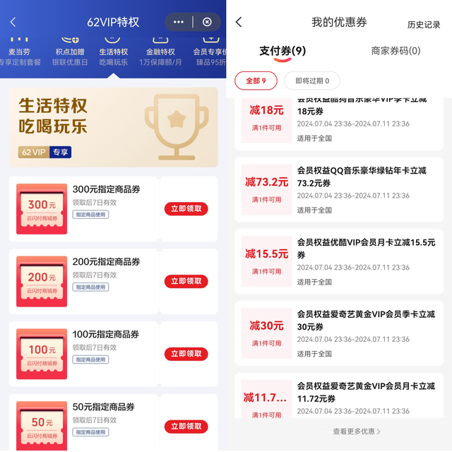50元、100元、200元、300元商城优惠券,每月可以领取以上四种总面值的优惠券,然后去云闪付商城使用。我就经常兑换优酷VIP给我家孩子看小猪佩奇使用。