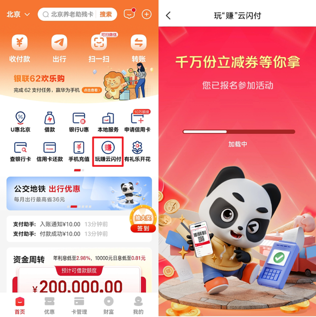 参加方法很简单,只需要打开银联云闪付App,点击“玩赚云闪付”进入活动页面,再点击下方的“去参加”就可以了。