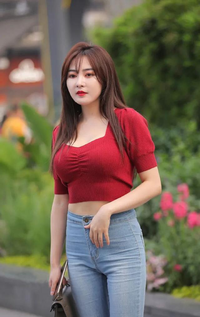 穿红色露脐短袖搭配牛仔裤凉鞋尽显玉足性感身材的时尚御姐