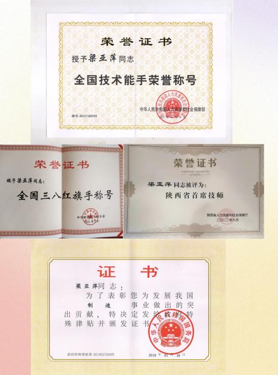 她获得的荣誉不胜枚举,包括“全国三八红旗手”“陕西省首席技师”“三秦质量工匠”等等。
