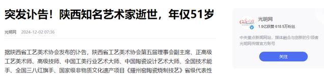 信息来源:光明网于2024年12月2日发布的——《突发讣告!陕西知名艺术家逝世,年仅51岁》