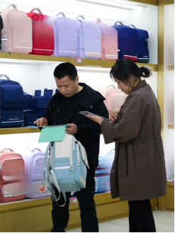经销商们被书包精致的设计、上乘的材质深深吸引,迅速围拢上前。大家纷纷上手体验,对书包的细节赞不绝口。“这背负系统太科学了,孩子背着肯定轻松舒适!” 一位经销商边调整肩带边感慨道。“外观也紧跟时尚潮流,小朋友见了准喜欢。” 另一位经销商附和着,现场对书包的认可声此起彼伏,彰显出阳光 8 点书包卓越的品质。
