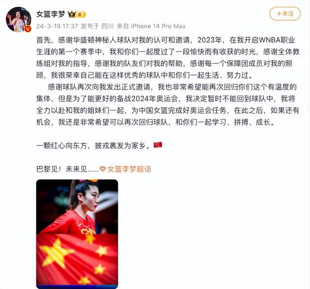 此前,女篮运动员李梦发文称,为了随中国女篮备战巴黎奥运会,婉拒了华盛顿神秘人队再次合作的请求。