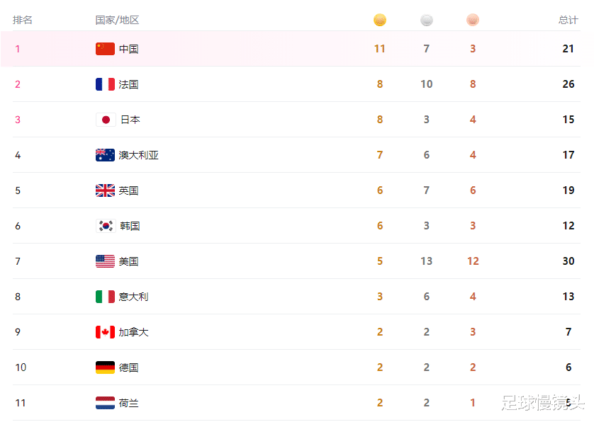 目前法国队排名第2位,金牌数是8枚,而日本队位居第3位,金牌数也是8枚,都已经落后我们3枚,要知道,第1名和第2名的差距,第一次来到3枚,也说明了我们的真正实力。