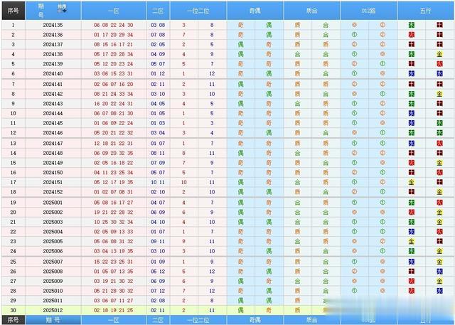 二、后区号码分析历史同期中,奖号12出现5次,奖号06、09、11出现4次,奖号01、02、05出现3次,奖号03、04、07、08、10出现2次。