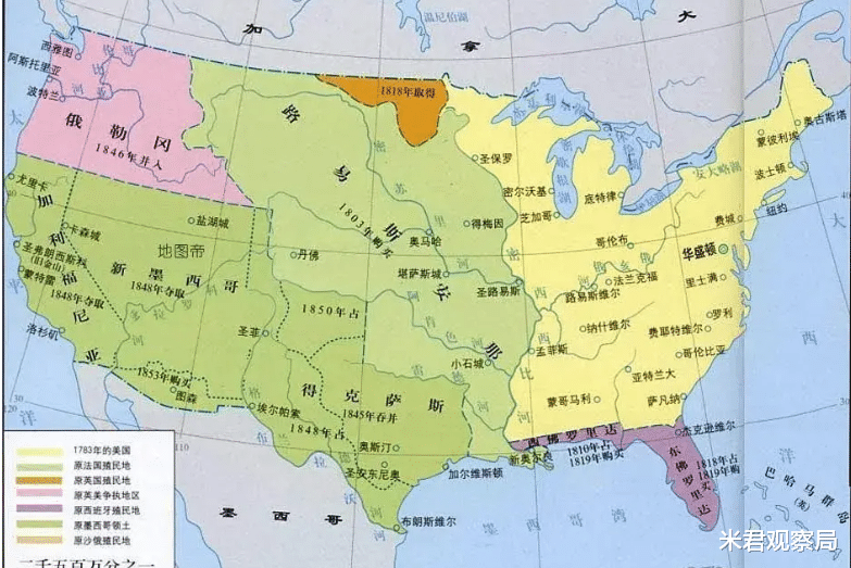 美国建国后,开始西进运动。美国向法国拿破仑出资购买了路易斯安纳。而很快就和墨西哥合众国成为了邻国。