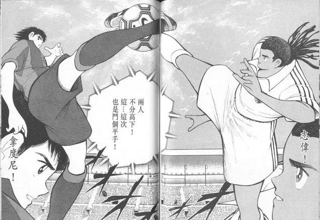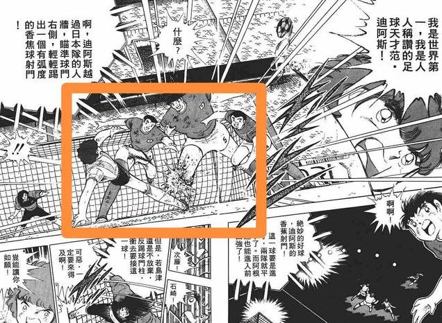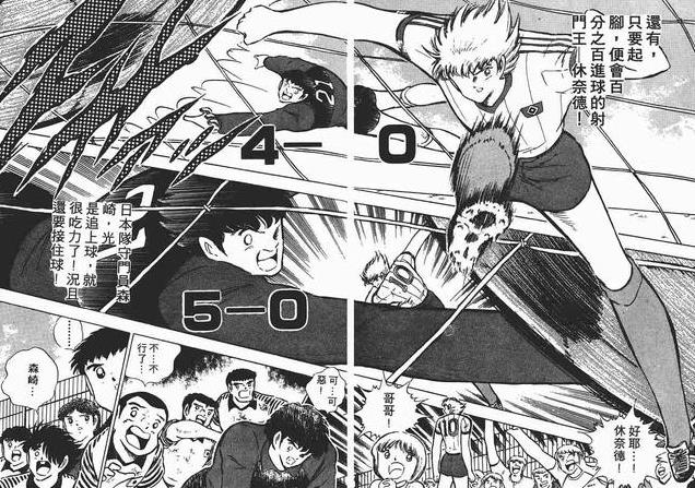 (图中是特别篇的内容,与荷兰队三场友谊赛,前两场大空翼不上场,岬太郎毫无作为,球队以大比分大败。第三场大空翼在场时,岬太郎带着球过了对方全队,一条龙得分,还摧毁了荷兰队的防线。)