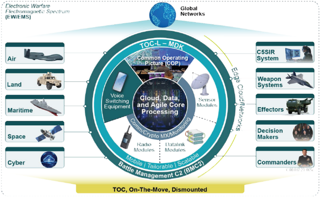 TOC-L多样化的模块集合(set of modules)支持指挥控制、数据链、无线电、雷达等多种作战功能,能够部署到具有挑战性的多域环境中,跟踪空中、地面、海上、太空和网络资源。