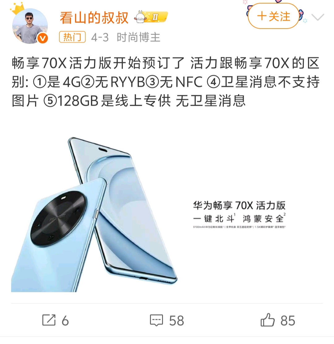 华为手机是我们国产的骄傲,华为手机的一举一动更是引发许许多多用户的关心,近期据华为经销商“看山的叔叔”透露,华为畅享70X活力版已经开始预订。跟随阳月的脚步来看看华为的最新千元神机吧!