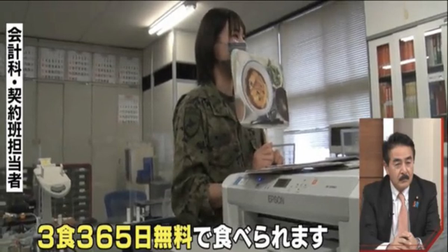 一个最具代表性的例子是,在2022年12月日本岸田政府调整国防策略,大幅增加国防开支后,招兵活动也上了强度,但在一则宣传视频里,最流行的Slogan却是:“365日3食食べれます!——365年3餐一顿不少!”。