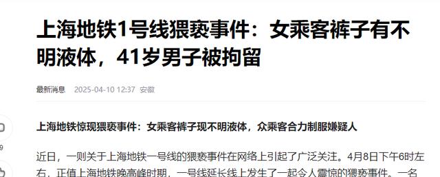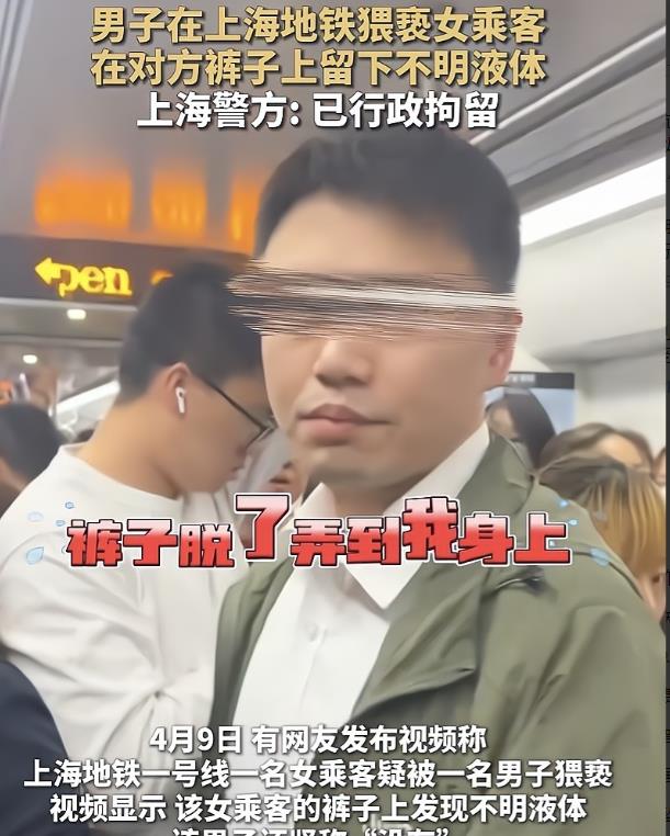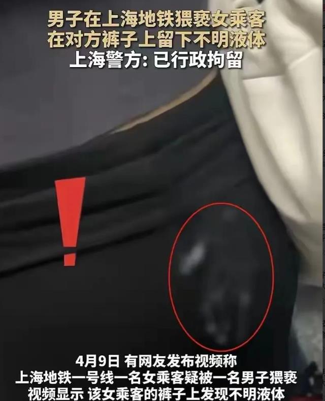 4月9日,上海有网友发视频爆料,称一号线上的一名女乘客疑似受到了同车男乘客的猥亵,甚至还在女乘客的裤子上留下了不明液体。