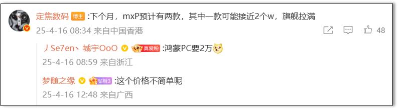 另一位评论区的爆料者指出,首款搭载HarmonyOS的PC售价可能在20000元左右。不过,这一价格信息的准确性仍有待进一步确认。