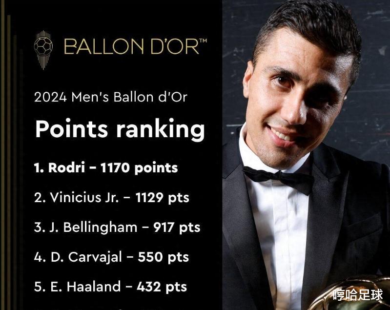 11月9日消息,本年度金球奖的最终投票情况已经出炉。金球奖主办方《法国足球》透露,罗德里以1170分当选金球先生,维尼修斯1129分排名第2,贝林厄姆917分排名第3,卡瓦哈尔550分第4,哈兰德432分第5。金球奖选票公布!老佛爷错信维尼修斯,力挺21岁巨星,皇马能获奖。