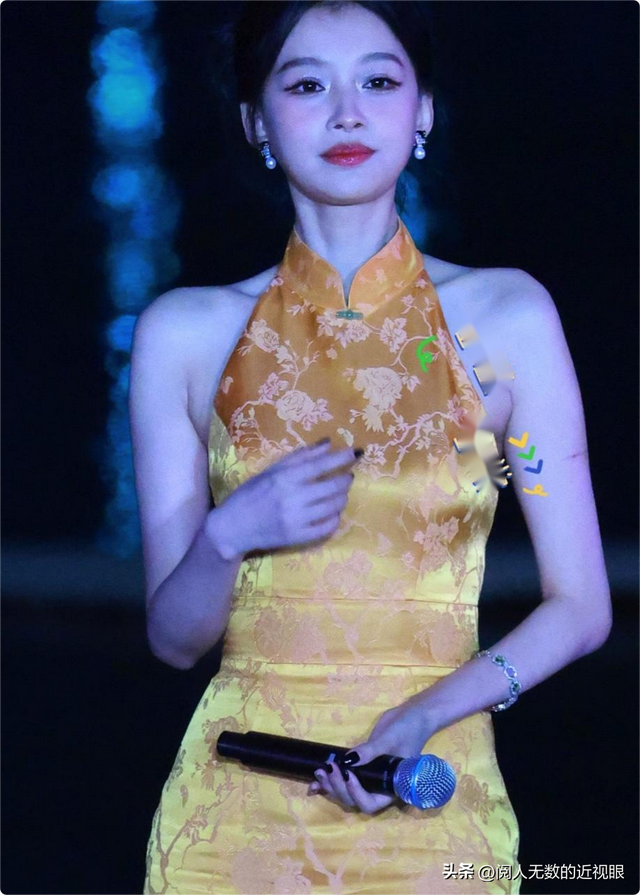 同样惊艳观众眼球的还有演员孙怡,她穿了一身明黄色的改良旗袍,旗袍的设计更显曲线,露肩的款式在不经意间展现她的妩媚。