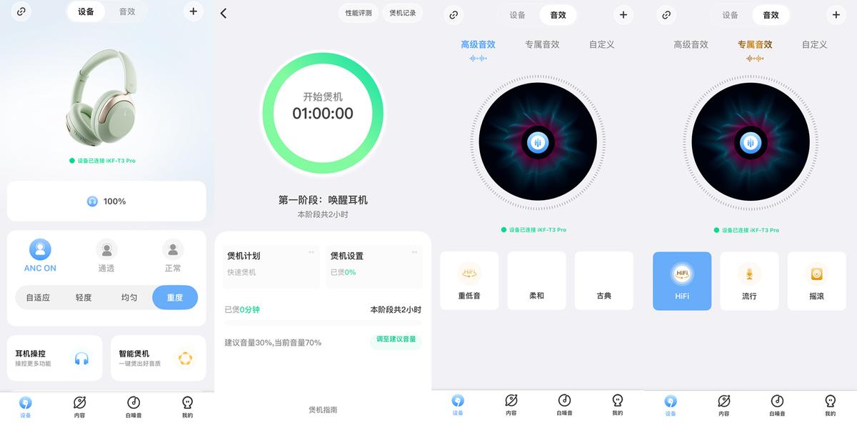 和汽车一样,耳机也需要经过磨合才可以达到最佳工况。iKF很贴心地提供煲机功能,让设备可以尽快达到最佳工作状态。APP内置了多种音效供用户选择,配合全新升级的360°全息空间算法,能够轻松应对各种音乐类型的挑战,为用户带来震撼人心的听觉盛宴。