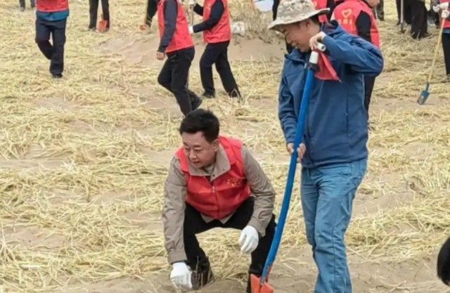 他穿着志愿者统一的红马甲,亲自下地劳作,从挖坑到种植全都亲力亲为。